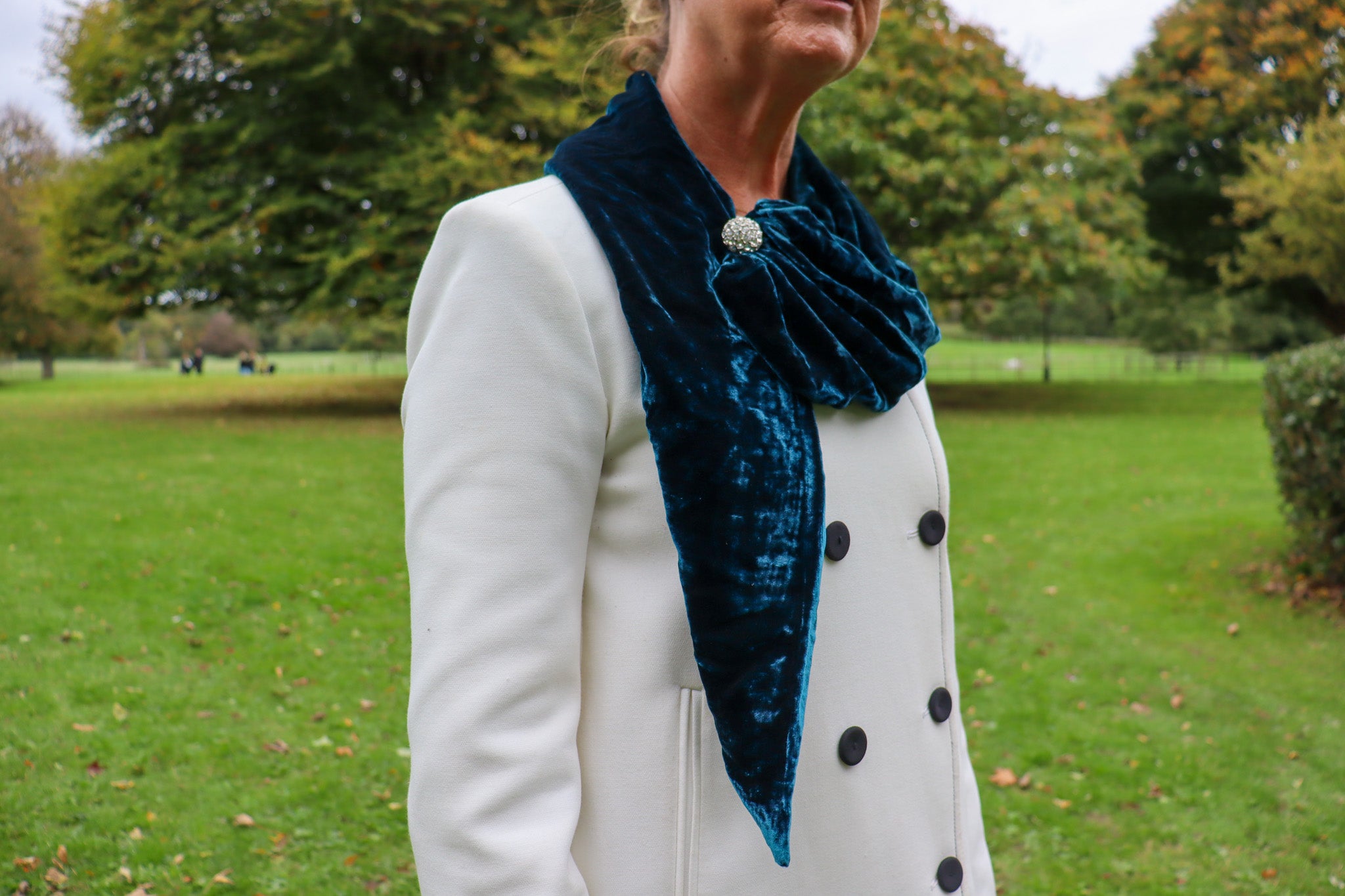 This version of our classic teal velvet scarf includes a beautiful diamanté brooch that not only adds a hint of sparkle but also keeps your scarf securely in place — no need to fuss with styling or knots. It’s a practical solution that looks effortlessly refined. The deep teal tone adds richness to any outfit, while the brooch offers just the right amount of decorative detail.